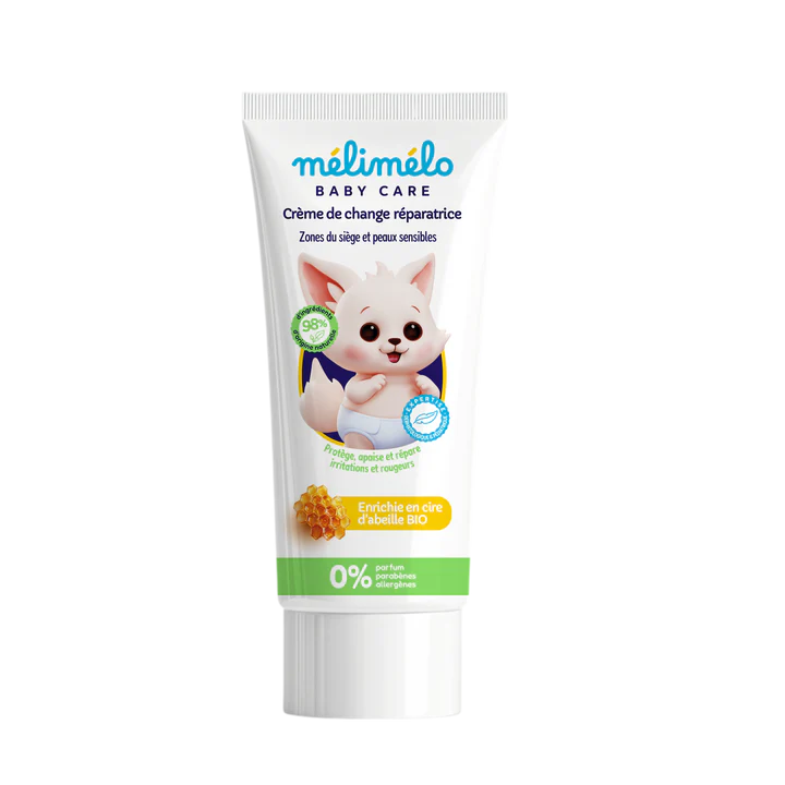 La Crème de Change Réparatrice Anti-Rougeurs Mélimélo est un soin haute tolérance spécialement formulé pour prévenir, apaiser et réparer les irritations du siège des bébés. Grâce à une combinaison d’actifs naturels protecteurs et apaisants, elle forme une barrière douce et respirante qui protège la peau contre l’humidité, les frottements et les rougeurs. Sa texture onctueuse s’étale facilement, sans effet collant, laissant la peau douce, souple et parfaitement protégée. Sa formule naturelle, enrichie en beurre de karité, huile d’amande douce, cire d’abeille, oxyde de zinc, extrait de camomille et vitamine E, forme une barrière protectrice et offre un soin complet pour prévenir et calmer les rougeurs et irritations.